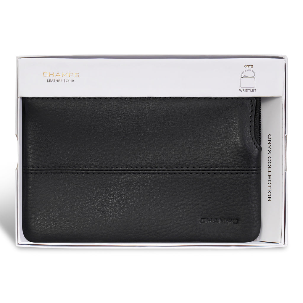 Introducing the Onyx Leather Wristlet, a perfect blend of elegance and practicality. Crafted from premium top-grain leather, this sleek wristlet features a secure top-zip closure and two dedicated credit card slots for effortless organization. Its minimalist design makes it a versatile accessory, whether carried alone or slipped into a larger bag. Compact yet functional, it’s an ideal leather essential. Beautifully packaged in a chic gift box, the Onyx Leather Wristlet makes for a timeless and sophisticated gift.
