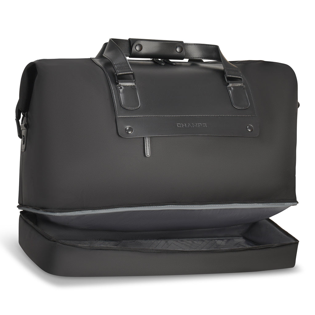 The Duffle Bag from The Onyx Collection is perfect for those who need extra room and organization for their travels. Crafted from water-resistant nylon material, this versatile and stylish travel essential boasts a spacious interior, ensuring ample room for all your belongings while keeping them protected from the elements. With an integrated RFID pocket, your personal information remains secure. The duffle bag features a padded 15.6" laptop and tablet sleeve with compression strap closure, keeping your tech devices safe and easily accessible on the go. Stay connected and powered up with the USB-C charging port and cable, allowing you to charge your devices wherever your journey takes you. For added convenience, the duffle bag can be easily attached to your carry-on luggage with the trolley strap, and it includes a hidden zippered pocket behind the trolley strap along with an inner removable key chain to keep things within reach. The removable and adjustable shoulder strap offers multiple carrying options for your comfort. Additionally, the lower zippered compartment is perfect for keeping shoes and dirty clothes separate from the main compartment, ensuring everything stays organized and fresh. Whether you're embarking on a weekend getaway or a longer adventure, the Champs Duffle Bag from The Onyx Collection combines durability, style, and innovation to elevate your travel experience.