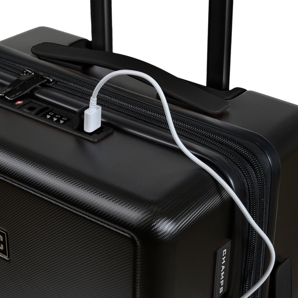 Carry-on with USB port for charging on-the-go (cable included, power bank not included)